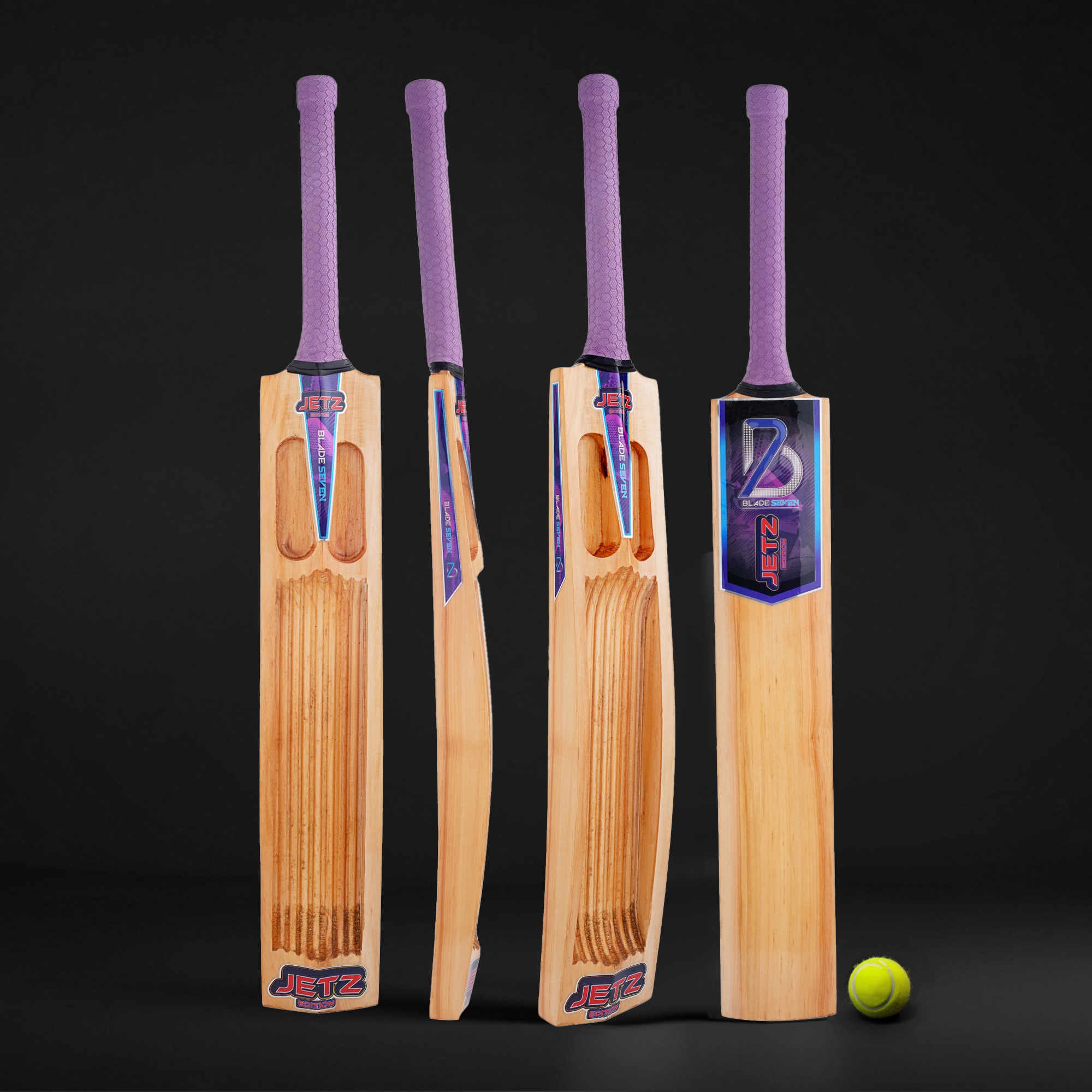 Meet the JETZ Grooved Edition Cricket Bat — where craftsmanship meets attitude. Designed for players who love a clean swing and a stylish blade, this bat stands out with its signature multi-groove pattern that not only elevates the look but enhances balance and handling. The smooth wooden finish combined with a lavender performance grip gives it a modern, striking appeal that turns heads on and off the pitch.